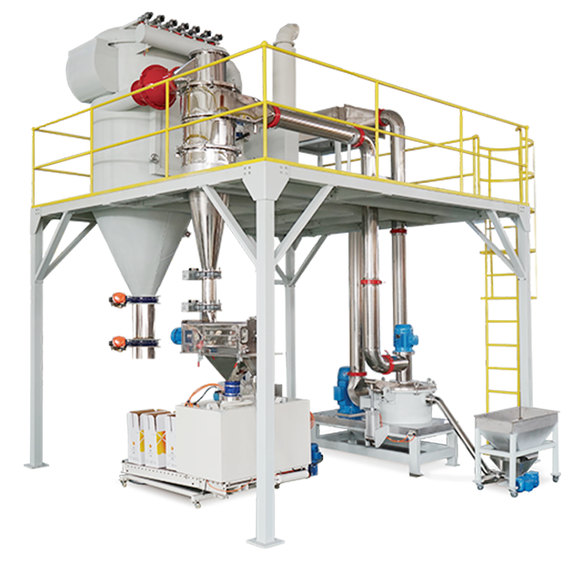 ACM系列磨粉系統ACM系列微粉粉碎系統由空氣分級磨、旋風分離器、旋轉篩或者振動篩、超細粉集塵箱和高壓風機構成。具有高速破碎、空氣分級、旋風分離、篩分和超細粉收集等功能。通過調整運行參數可以獲得理想的粒徑分布。ACM系列微粉粉碎系統也可以用于顏料、鈣粉、碳粉、藥品及食品的粉碎。